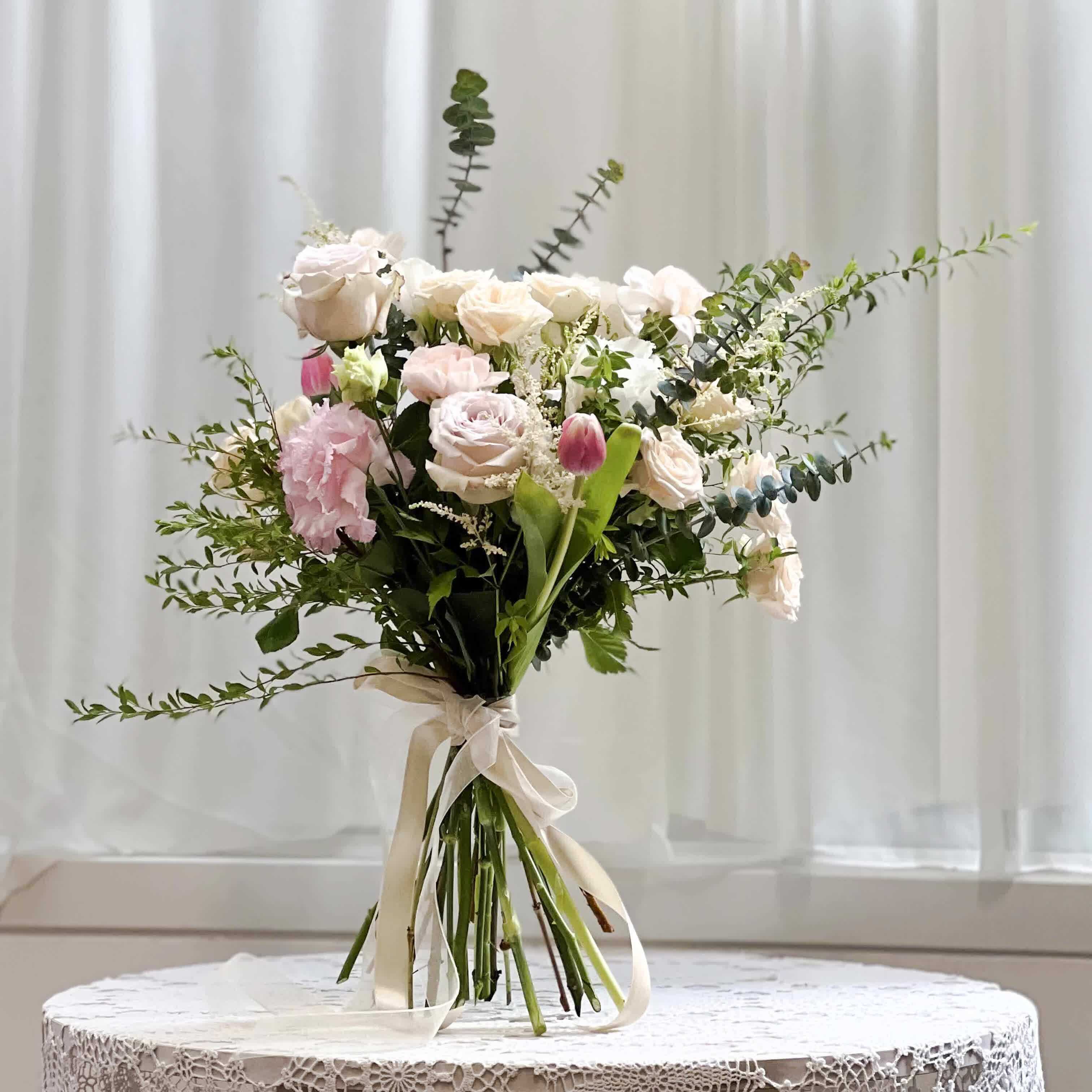 商品詳細資訊: 尺寸→ 約30cm(直徑) x 約25cm(高) 成分→ 玫瑰、桔梗、鬱金香、康乃馨、雪柳葉、尤加利葉 新鮮葉材、包裝紙、緞帶