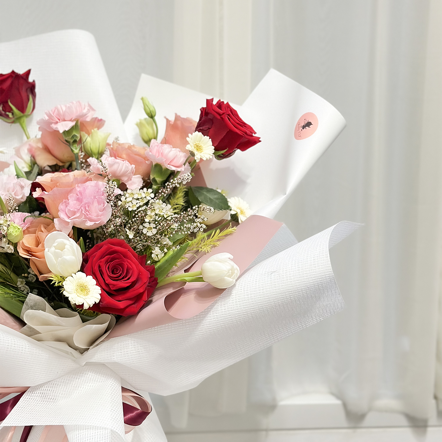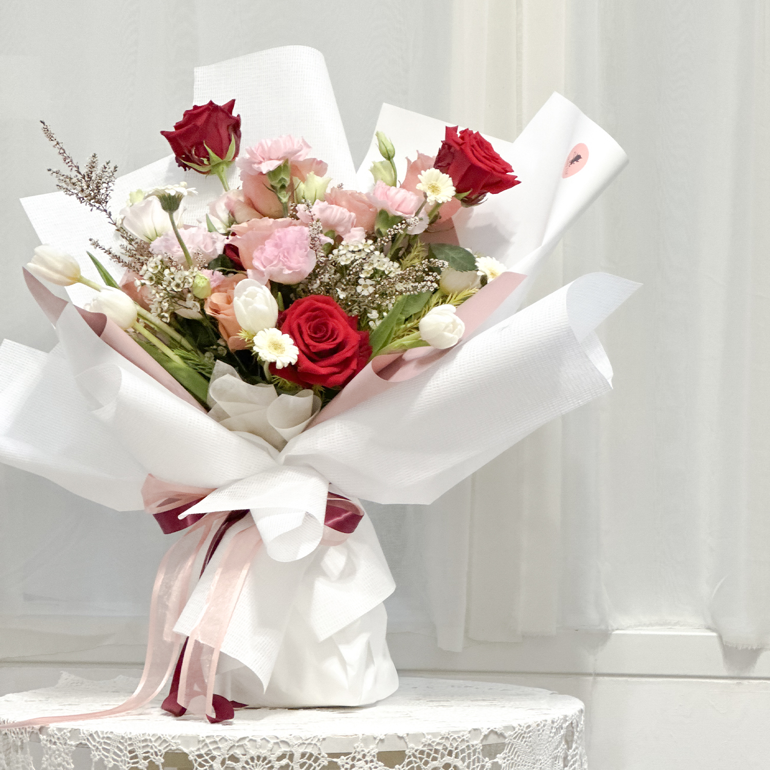 成分→  玫瑰、綠石竹、尤加利葉、新鮮葉材、包裝紙、緞帶